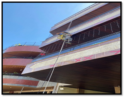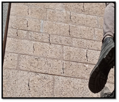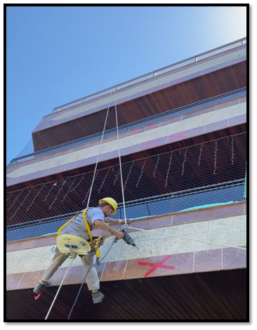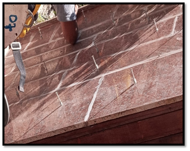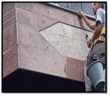 Teste de Percussão da Fachada, Substituição das pedras que soltaram e fixação com parafuso de aço inoxidável AISI 316 em todas as pedras.